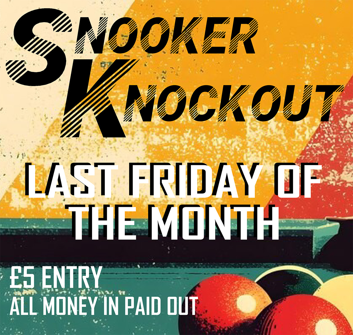 Join us for our Friday Night Snooker Knockout held on the last Friday of every month! All entry fees are paid out in winnings, so there’s everything to play for. Players should arrive before 6:45pm for a 7:00pm start. The match format will vary depending on the number of entries, with handicapped and scratch competitions alternating each month — offering a fun and competitive evening for players of all levels.